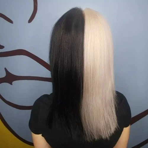 Person with split hair dyed half black and half blonde, viewed from the back.